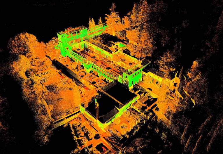 Junto al vuelo fotogramétrico de alta resolución se realizó un vuelo LiDAR para dar un soporte topográfico de alta precisión no solo al área monumental sino también al entorno montañoso y cubierto de vegetación que la rodea y que, dada su resolución, se convierte en una herramienta inestimable para el estudio de la infraestructura hidráulica que alimenta al conjunto palatino.